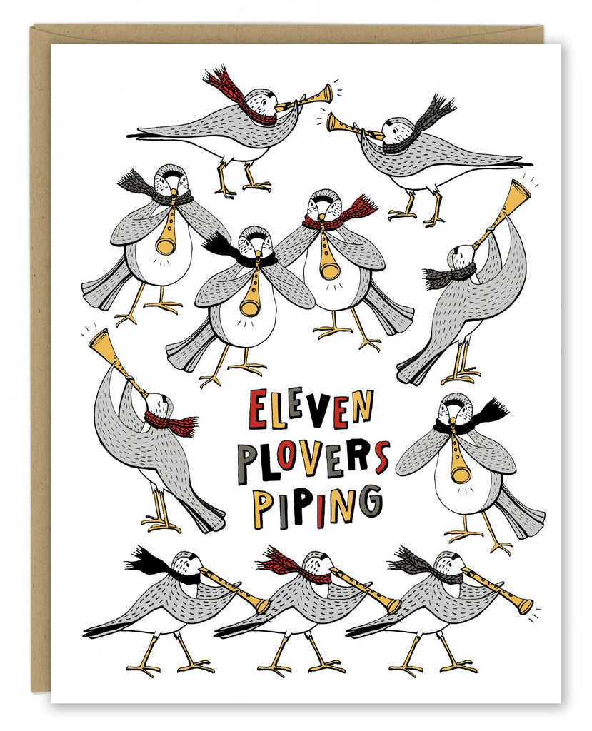 With a nod to the original 12 Days of Christmas, this hand-drawn collection of eleven plovers piping is a whimsical holiday card sure to please bird lovers and more!
