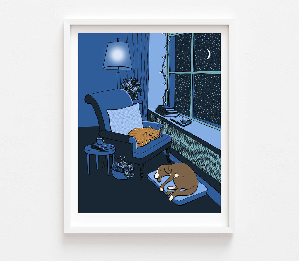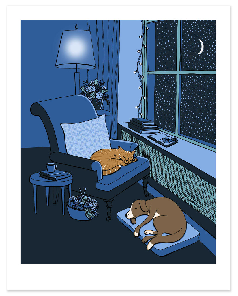 Cat and dog are tucked in cozily while snow falls outside the window and the room is bathed in blue moonlight. An open book, a basket of knitting and a steaming mug complete this calm nighttime scene.